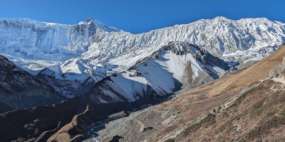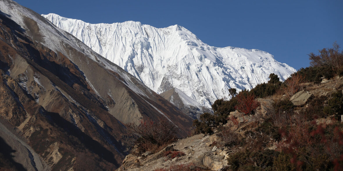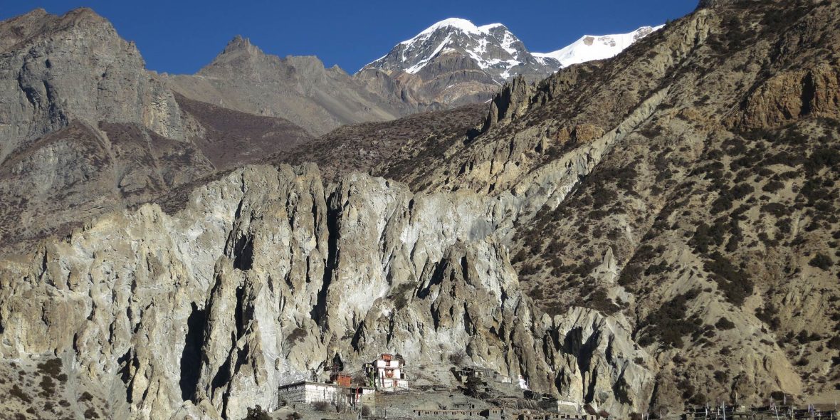 Beyond Pisang, the trail climbs a steep ridge which affords good views of the Manang valley and Tilicho peak. Descending past Manang’s airstrip at Hongde, we come to a level area from where the northeast face of Annapurna III rises majestically above us. From the wide plains of the Sabje Khola Valley, Annapurna IV [7525m] also becomes visible. Just beyond this point, we cross the considerably reduced flow of the Marsyangdi Khola via a wooden bridge to the tiny village of Mungji. Cultivated fields appear on both sides of the path and off to the right, below a craggy mountain, we can see the village of Bryaga with its splendid monastery. Large chortens and mani walls abound and the tall peaks of the Himalaya spread out before us – Annapurna II, Annapurna III, Annapurna IV, Gangapurna [7455m] and, to the rear, Tilicho Peak [7134m]. After a short steep climb, we reach Manang which is a surprisingly large village for this remote mountain region.