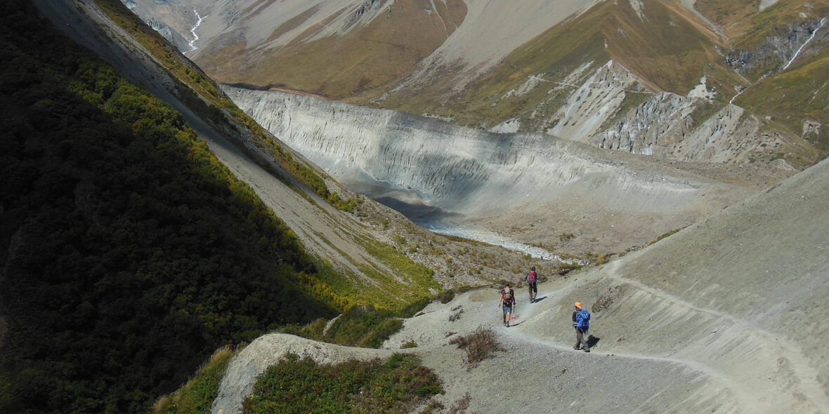 This morning we continue on from Khangsar on a large, recently built path past a Gompa (monastery) and on up towards a high ridge. We reach an intersection of the new trail and the old trail – and we take the new trail and climb to a high crest before descending on switchbacks carved out through the scree slopes. We reach a side valley and, crossing the little stream at the bottom, we come to a building known as Tilicho Base Camp.