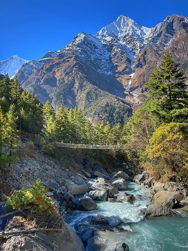 We now walk through a pine forest and as the forest ends, the valley changes from a V-shape to a gentle U-shape, opening up a wonderful vista before us. We can see the east peak of Annapurna II as well as Pisang Peak to the northeast. Continuing on, we come to a long mani wall by a bridge and the lower village of Pisang.