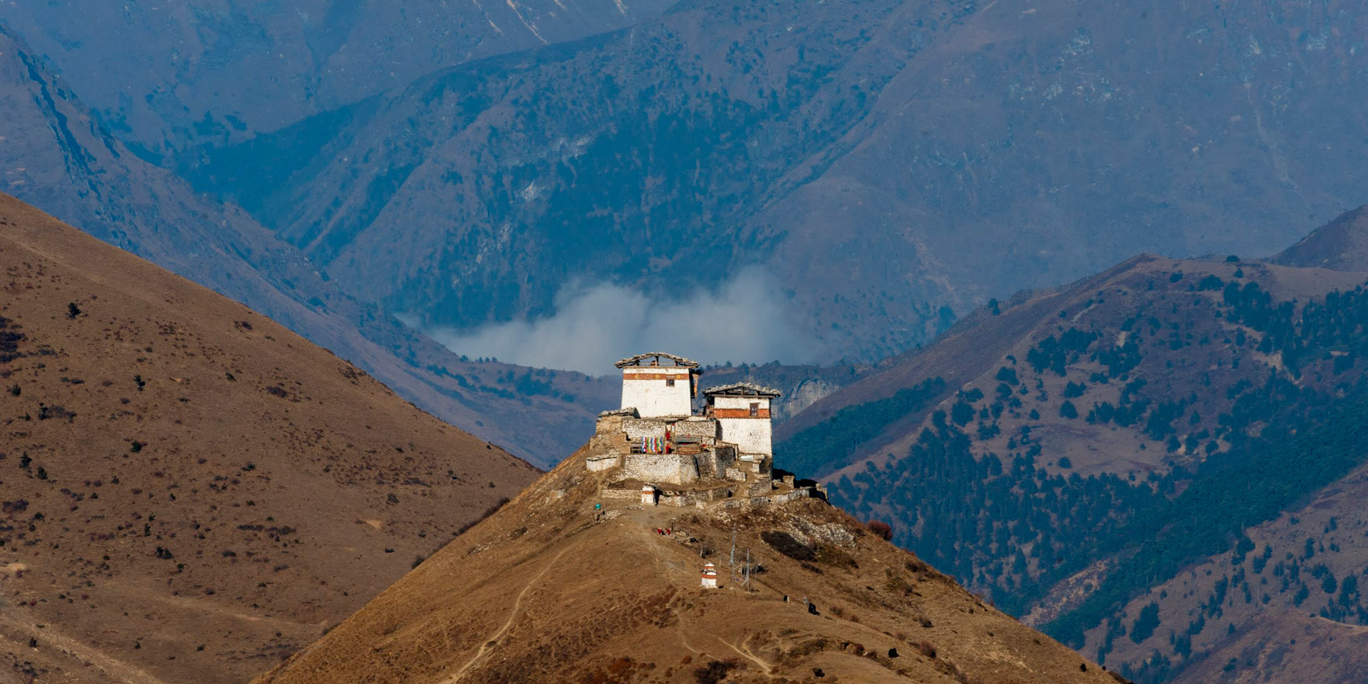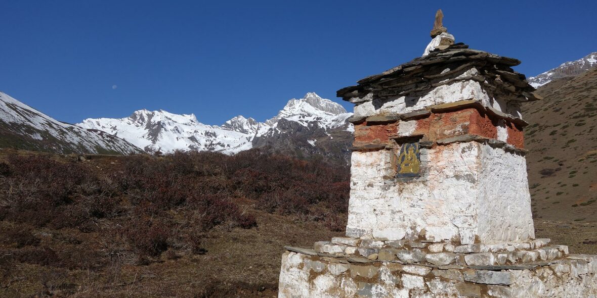Not long before reaching the campsite, the trail leads you up a ridge with a chorten (CHORTEN: Buddhist monument).