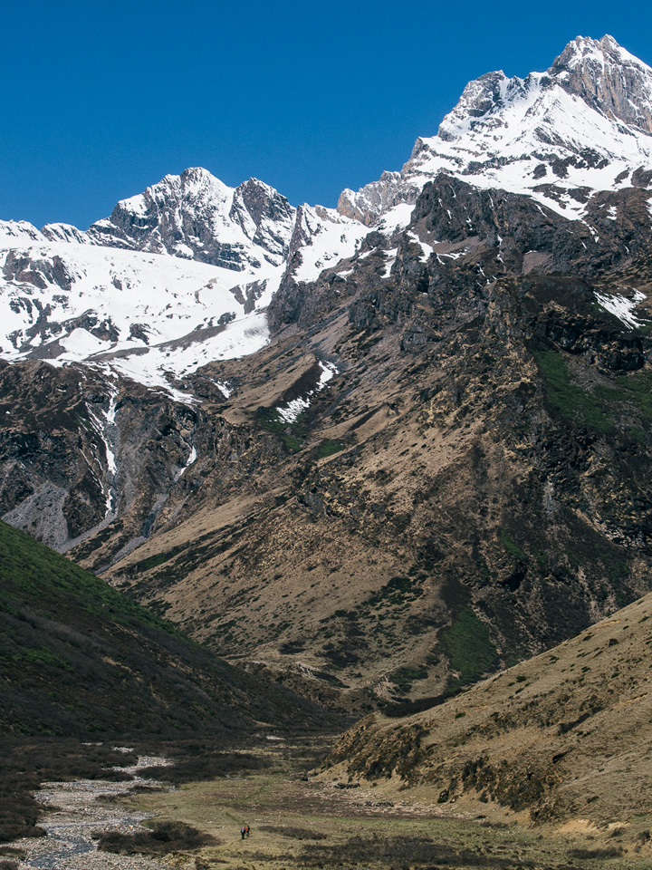 Alternatively, a 2 hour hike to a lake above camp provides a stunning location for photographs of Jitchu Drake. Green grass, grazing yaks, stunning mountain scenery – it doesn’t come much better than this. For a spectacular view of Jitchu Drake closer to camp (even better at sunrise if you can get up sufficiently early), follow the river for 20 minutes to a lone house and here the mountain is presented before you.