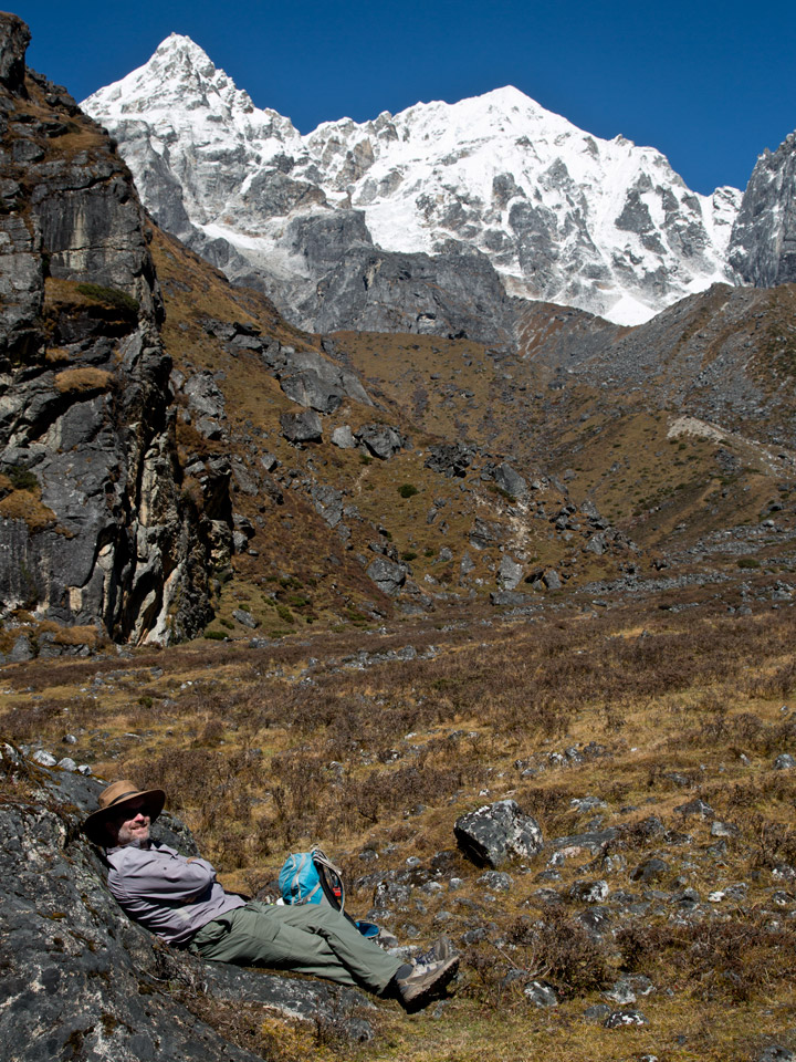 The trail now eases off, still ascending, but less steeply now as we traverse around the ridge amid semi-alpine plants and open views across the smokey middle hills in the distance. The couple of simple lodges appear suddenly after a rise, and probably not a moment too soon for well worked legs. Dawa, the friendly lodge owner, is an expedition cook and whips up a storm in his simple kitchen. Snow leopard have been seen from this camp in the last couple of years!