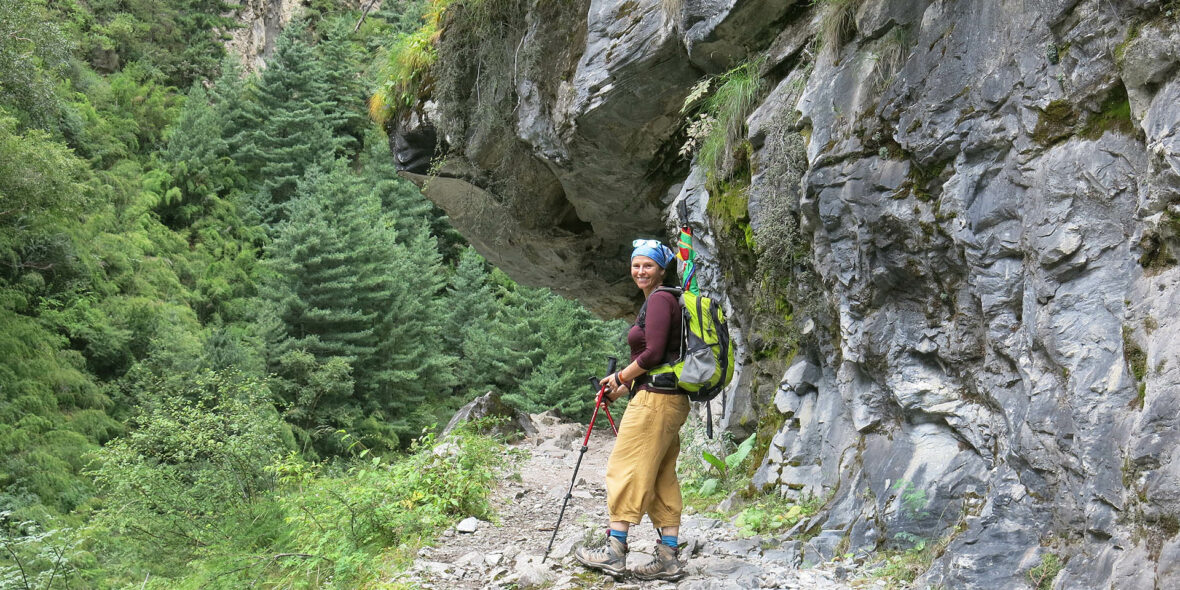 The route takes us through some beautiful woods and past several small shelters (caves) and a pilgrims’ ‘Dharmasala’. As we emerge out of a narrow canyon, the trail actually passes under a wide waterfall just before the Dharmasala, from which point the woods become thinner and the vistas wider. The last stretch into Meta takes us up a steep hill from where we get amazing views of some of the giant snowy peaks in the area. Meta lies on a big open plain and consists of a few lodges, which are simple but clean and offer you a good hearty meal.