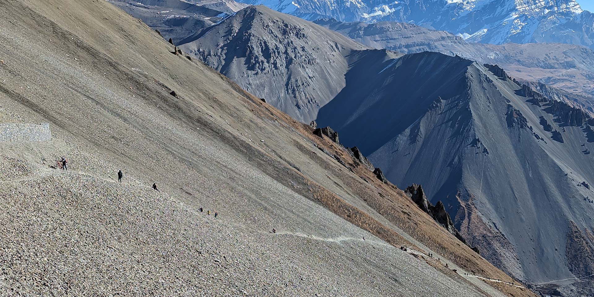 From Khangsar, we continue along a wide, newly constructed path that takes us past a Gompa (monastery) and up toward a high ridge. We arrive at an intersection where the new trail meets the old. We choose the new trail, climbing to a high crest before descending along switchbacks carved into the scree slopes. After reaching a side valley, we cross a small stream at the bottom and arrive at the buildings that make up Tilicho Base Camp.