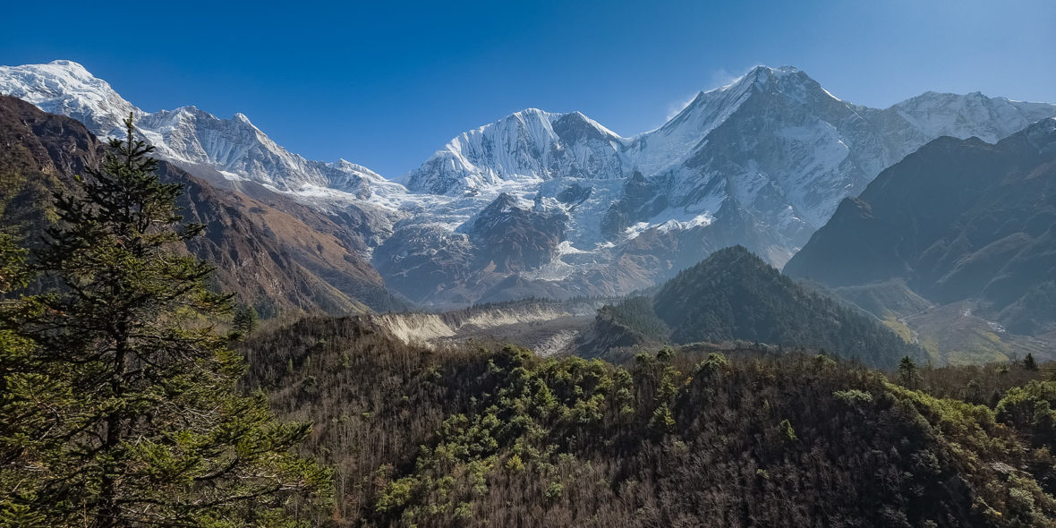 The start to the walk up the valley in in beautiful forest on a small trail but as we get high up we come out of the trees and into the open. As we get above the treeline the views also start appearing and about 4 hours from Karche the view of Manaslu 8163m really opens up. We might stop here for our packed lunch or continue further up the valley to get a better view of the glacier as well.
